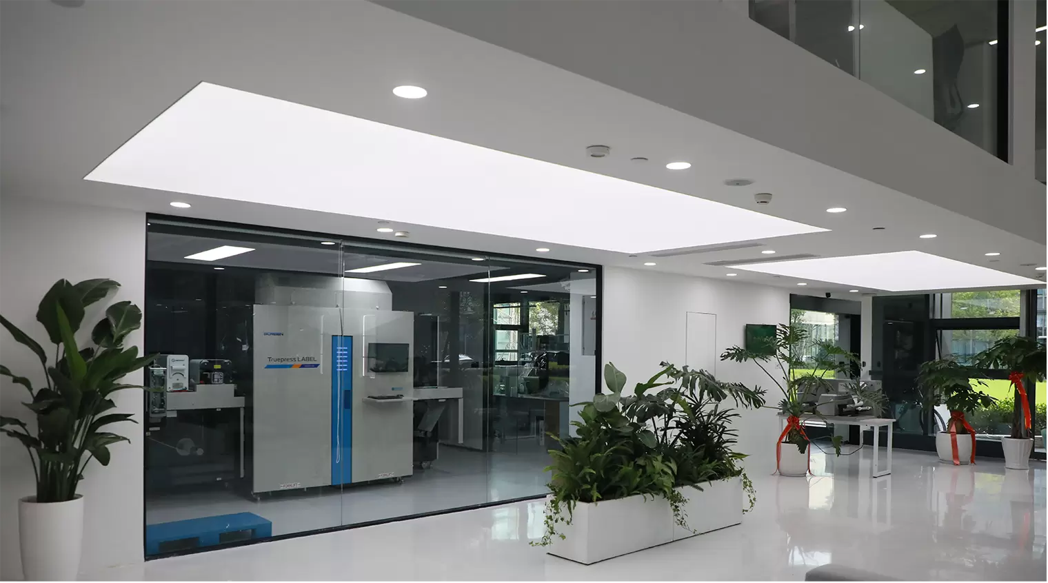 会议后,瑞町团队引导田中社长一行参观了松江新总部的施工装修现场及材料分切工厂,并介绍了一楼展厅网屏 UV 标签喷墨打印机展示区的详细规划,此外双方还就工厂的未来运营规划进行了深入交流,并共同探讨了如何通过更紧密的合作提升生产效率和产品质量。